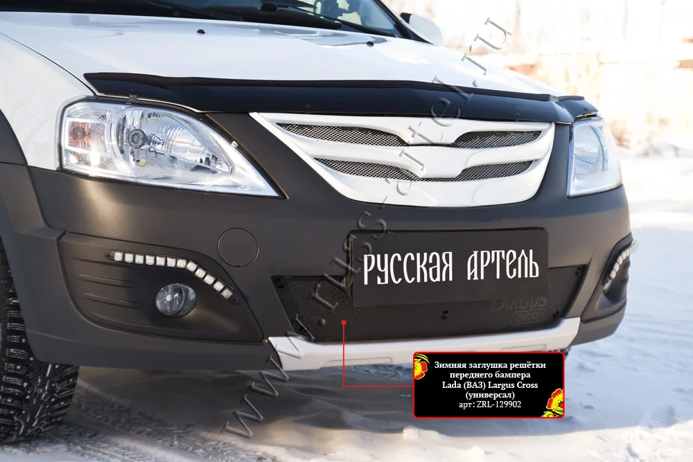 Зимняя заглушка решетки переднего бампера сокращает поток холодного воздуха, попадающего в моторный отсек, а, следовательно, позволяет двигателю быстрее прогреваться и расходовать меньше топлива. Также данная заглушка служит дополнительной защитой радиатора от мелких камней, осколков льда, скрывающихся в сугробах веток и других предметов, способных повредить радиатор автомобиля.Так как зимняя заглушка изготавливается из АБС пластика, она не боится моек и может использоваться несколько сезонов подряд. Крепится она с помощью нейлоновых хомутов, что позволяет с легкостью и без затрат большого количества времени проводить ее монтаж и демонтаж.Полный комплект поставки зимней заглушки для автомобиля Lada (ВАЗ) Largus Cross (универсал) 2015- года выпуска включает в себя следующие элементы: деталь из АБС-пластика, нейлоновые стяжки (включая запасные).