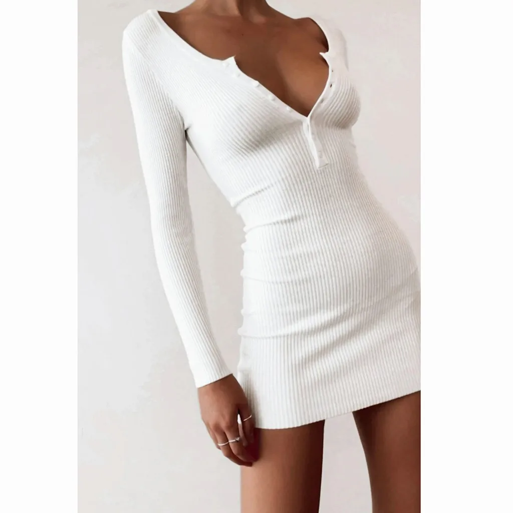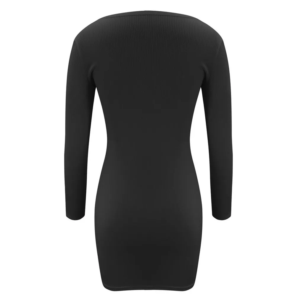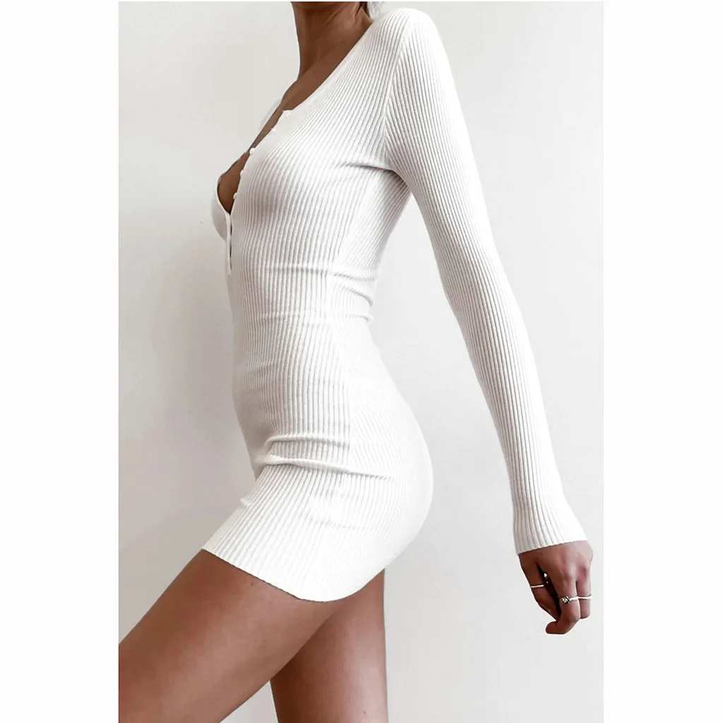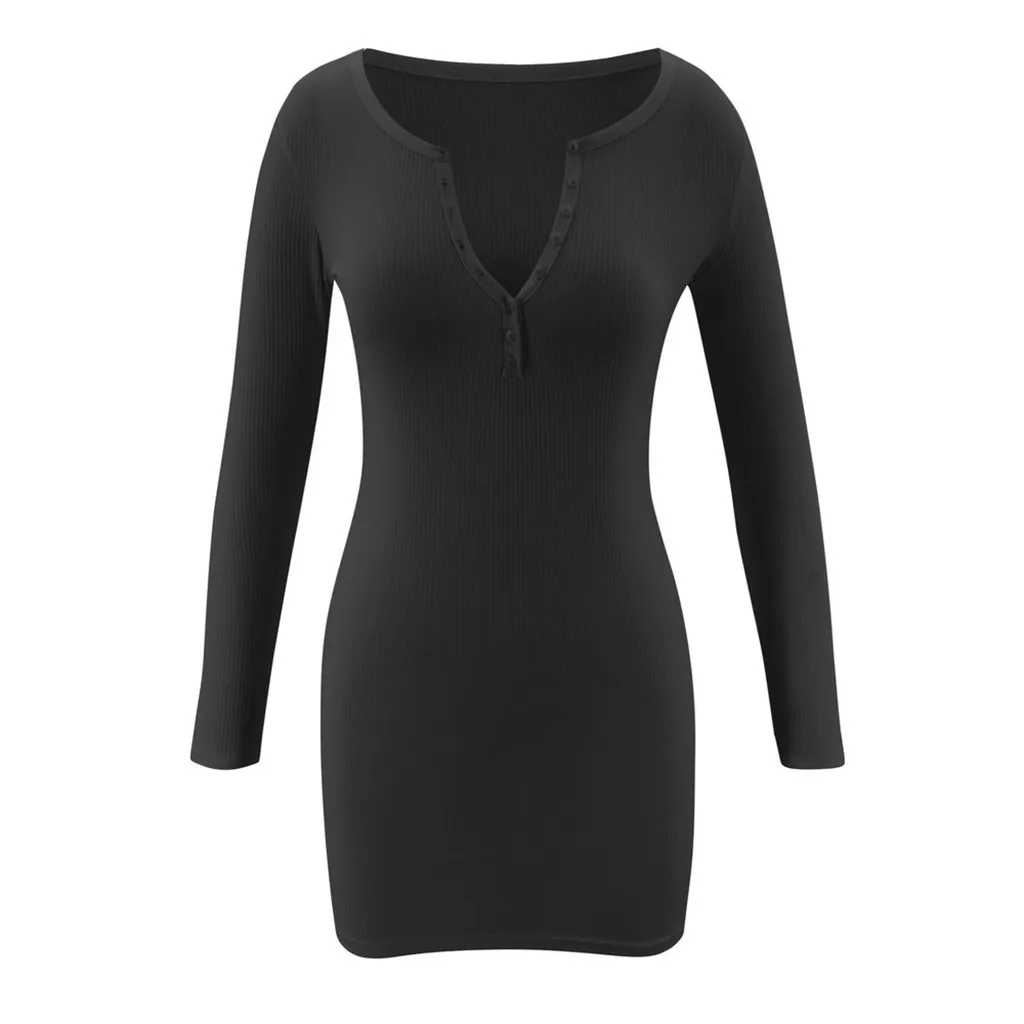 Женский однотонный вязаный v-образный вырез Платье-свитер с длинными рукавами