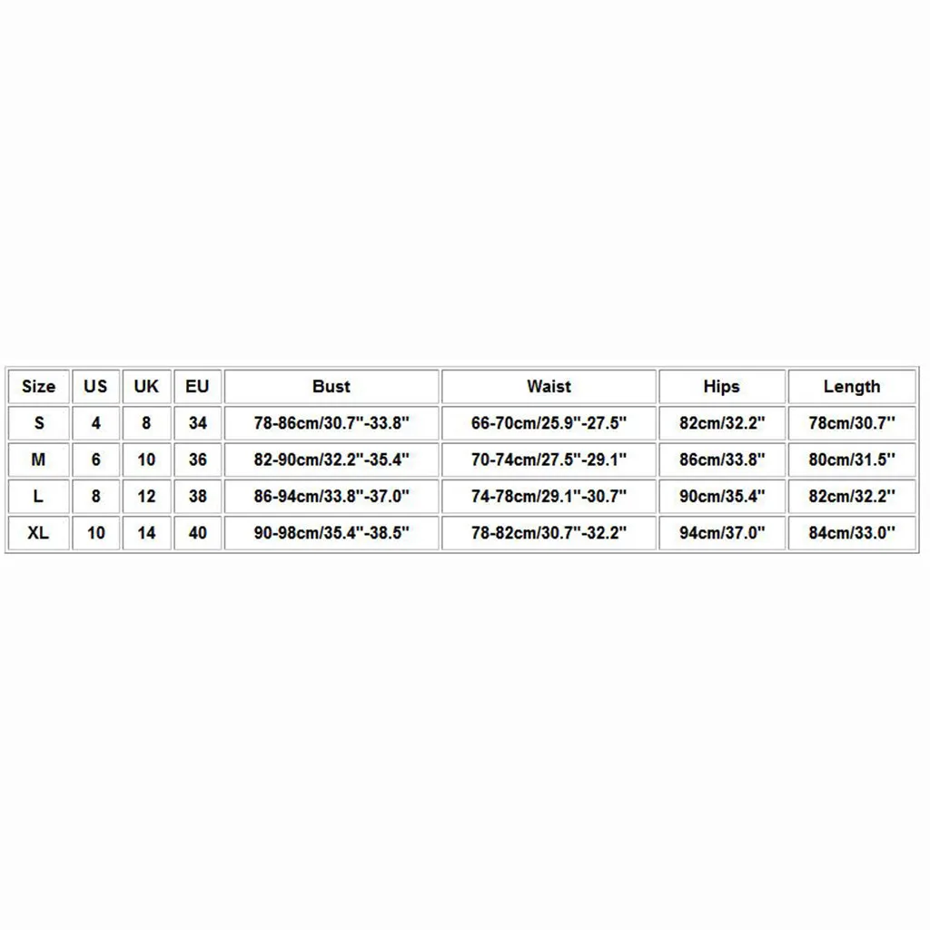 Размер США Великобритания ЕС Бюст Талия Бедра Длина S 4 8 34 78-86 см/30,7 "-33,8" 66-70 см/25,9 "-27,5" 82 см/32,2" 78 см/30,7'' М 6 10 36 82-90 см/32,2 "-35,4" 70-74 см/27,5 "-29,1" 86 см/33,8" 80 см/31,5'' L 8 12 38 86-94 см/33,8 "-37,0" 74-78 см/29,1 "-30,7" 90 см/35,4" 82 см/32,2'' XL 10 14 40 90-98 см/35,4 "-38,5" 78-82 см/30,7 "-32,2" 94 см/37,0" 84 см/33,0''