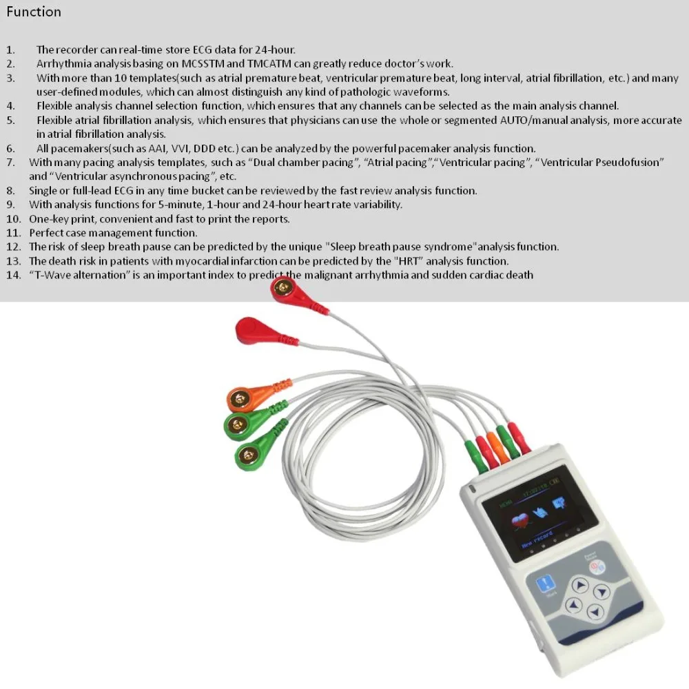 Особенности записи 1. Благодаря передовому дизайну и технологии регистратор может работать стабильно, надежно и долговечно. 2. Обеспечивает возможность защиты от помех и ударов. 3. Небольшой объем с oled-экраном. Разрешение 160*128. 4. Снабжен функциями предварительного просмотра формы волны, обзора записи и маркировки событий. 5. Точная запись времени начала выборки данных из-за реального времени само по себе. 6. Избегайте повреждений из-за повторной вставки и вытягивания с помощью встроенной TF карты для хранения данных. 7. Максимальная возможность может быть 2 Гб, поэтому оригинальные данные могут быть сохранены полностью без сжатия. 8. Средние обзора время один чехол может быть меньше, чем 40 секунд с помощью интерфейса USB 2,0. 9. Детали формы сигнала записи inextenso по дизайну высокой точности и частоты выборки. 10. Запись состояния кардиостимулятора точно на более высокую частоту выборки. Особенности программного обеспечения 1. Быстрая и точная система анализа. 2. С 3 выводами синхронного анализа, QRS поиск может быть более точно. 3. Существует более 10 шаблонов, таких как предсердный модуль преждевременного beat, желудочковый модуль преждевременного beat, модуль с длительным интервалом, модуль с трещинами предсердий, модуль фибрилляции предсердий и т. Д. И множество пользовательских шаблонов могут почти определить все виды патологических сигналов. 4. Дополнительный основной канал. 5. Гибкий и точный анализ «фибрилляции предсердий». 6. Функция шагового анализа может анализировать все кардиостимуляторы. 7. Было добавлено много модулей для шаговых операций. 8. Любой период одиночного свинца или 3 провода ЭКГ можно рассмотреть в любое время с функцией быстрого обзора и анализа формы волны. 9. Типы системы анализа вариабельности HR включают пять минут короткого ЭКГ и один час или 24 часа длинного ЭКГ. 10. Печать отчета. 11. Идеальная функция управления чехол. 12. С функцией анализа сегмента ST и общей нагрузкой на расстройство сердечной мышцы, терапевт может оценить болезни или расстройство сердечной мышцы в целом. 13. «Анализ синдрома остановки дыхания во время сна», терапевт может печатать отчет об асфиксии сна и диагностировать. 14. "HRT" анализ, когда Регулируемая функция естественная, это переходное изменение будет представлено формой HRT немедленно. 15. Анализ "T Wave Alternation" является важным индексом для оценки и предотвращения Аритмии. Стандарт 1. Количество каналов: 3 канала 2. Частота дискретизации: 10000 Гц 3. Точность выборки: 12 бит 4. Время записи: 24 ч 5. Мощность: 2 батареи в размере 5 6. Интерфейс: USB2.0 7. Масштаб напряжения: 1mV5% 8. Стандартная Чувствительность: 10 мм/mV5 % 9. Уровень шума: <= 0 В 10. CMRR: >= 60 дБ 11. Перья низких частот: постоянной времени> 3,2 s 12. Скорость сканирования: 25 мм/s5 % 13. Продолжительное напряжение поляризации: 300 мВ 14. Минимальный сигнал измерения: 50 µV p-p 15. Безопасность продукции Тип: Тип B (Внутреннее питание); 3-свинцовыми проводами Аксессуары 1. 1 Holter Recorder 2. 1 CD программного обеспечения 3. 3-свинцовый терпеливый кабель 4. Пакет ЭКГ электрод 5. 1 крыльцо для подвесного рекордера 6. 1 USB кабель для загрузки данных 7. Руководство по эксплуатации Размеры и вес 1. Размер: 111 мм (Д) * 60 мм (Ш) * 25 мм (В) 2. Вес: 105 г