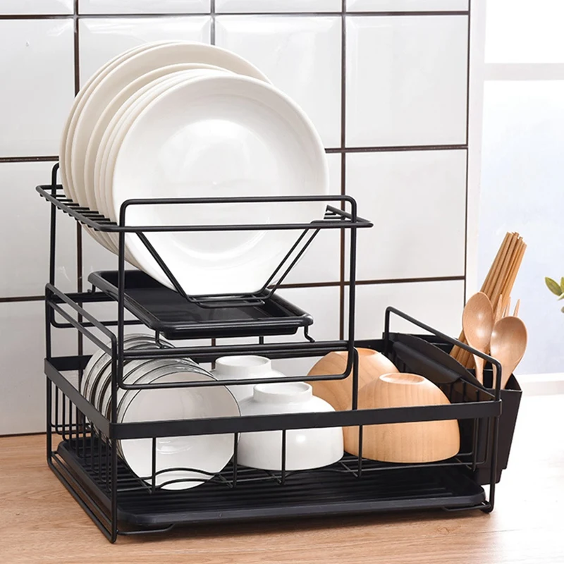 Dish rack and drainboard set adopts double-layer design, which saves 80% of kitchen counter space. The dish rack top level is for storing dishes and wine glasses while the bottom rack holding for bowls, fruit, pots and pans. With the heightened side of the dish rack, you can put the cutting board and utensil holders for both sides, allows you to put spoons, forks, knife, and so on.