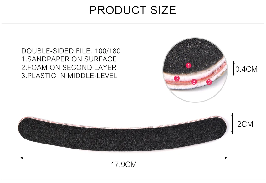 Особенности: 100% новый и высококачественный Профессиональная тонкая пилка для ногтей наждачной бумагой Идеально подходит как для профессионального, так и для личного использования! Идеально подходит для ухода за пальцами, деревообработки и использования в салоне Может использоваться для подпиливания натуральных ногтей, накладных ногтей, наращивания ногтей и т. д. Наждачная бумага на поверхности, пена на втором слое, пластик среднего уровня. Устойчивость к переломам. Основные инструменты для нейл-арта для подпиливания ногтей перед обработкой ногтей/наращиванием ногтей/маникюрными процедурами Характеристики: Тип товара: пилка для ногтей Двусторонний напильник: 100/180 Размер: 17,9*2,0*0,4 см Цвет: черный Посылка входит: Пилка для ногтей, 1 шт.