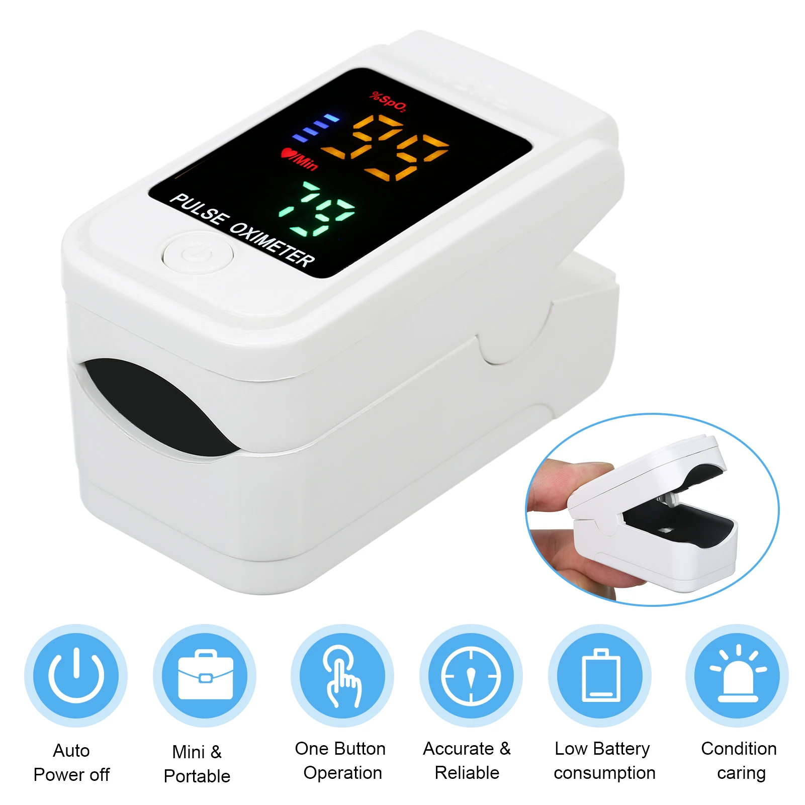 Оксиметр может использоваться для измерения насыщенности кислородом и частоты пульса через палец. Подходит для семейного и индивидуального ухода при ежедневном использовании.