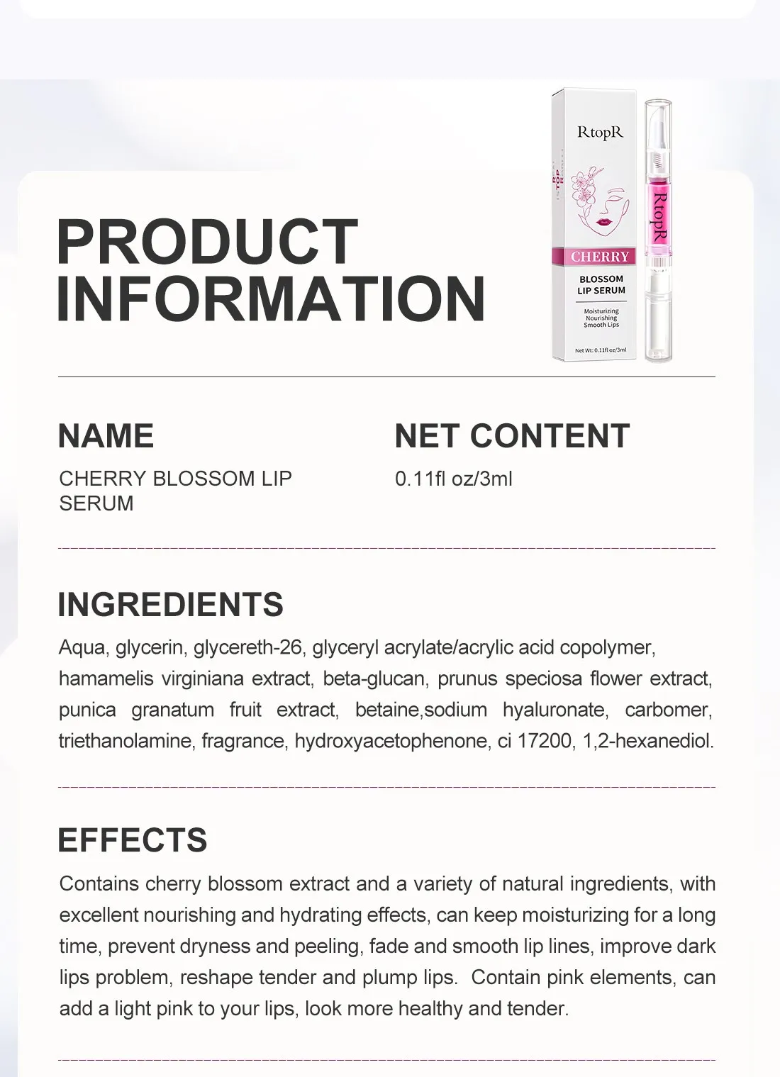 Содержит экстракт цветущего вишни и различные натуральные ингредиенты. Он обладает отличным питательным и пополняющим эффектом. Увлажняет, предотвращает сухость и шелушение. В то же время он может разбавлять и разглаживать линии губ, улучшать губы и восстанавливать нежные и влажные губы.