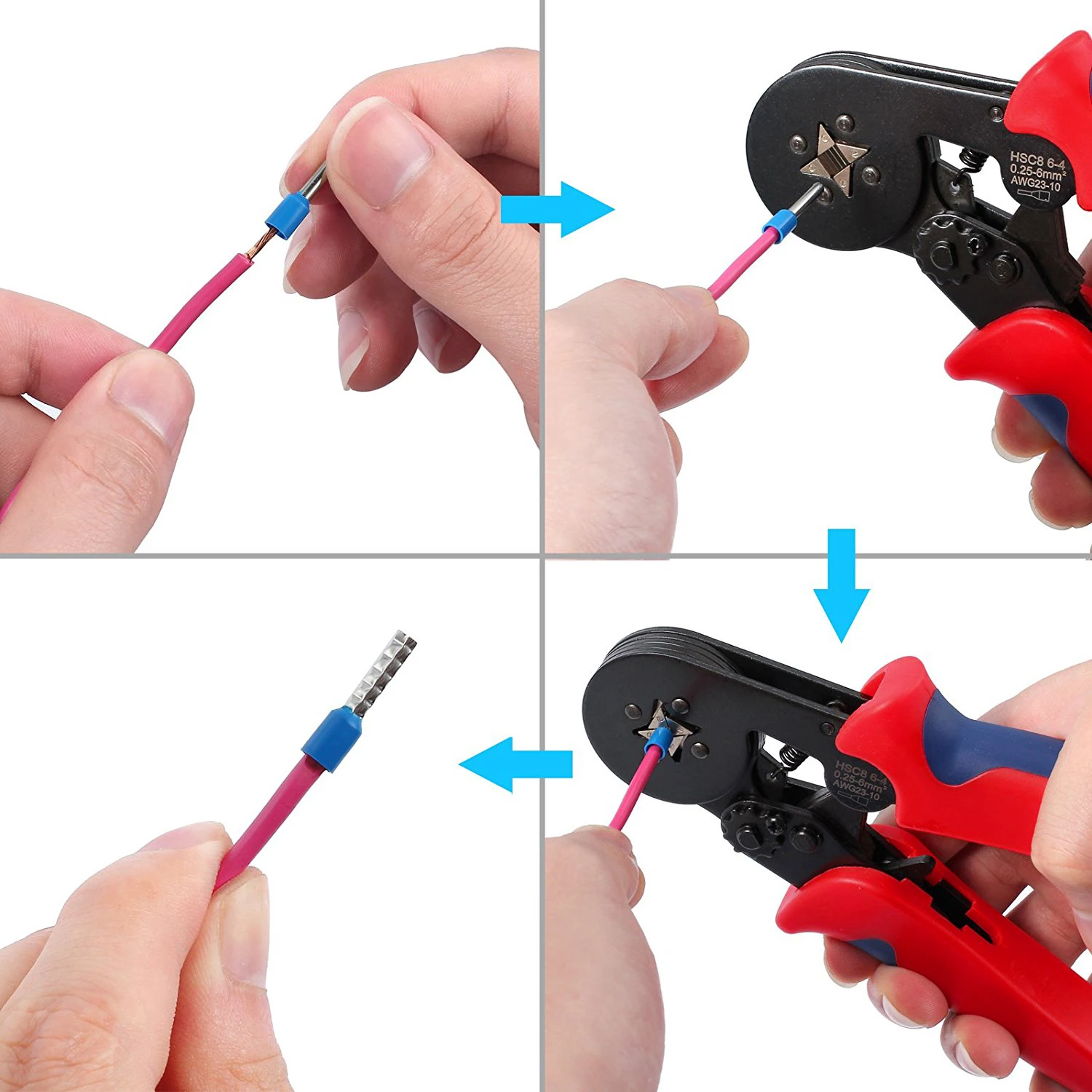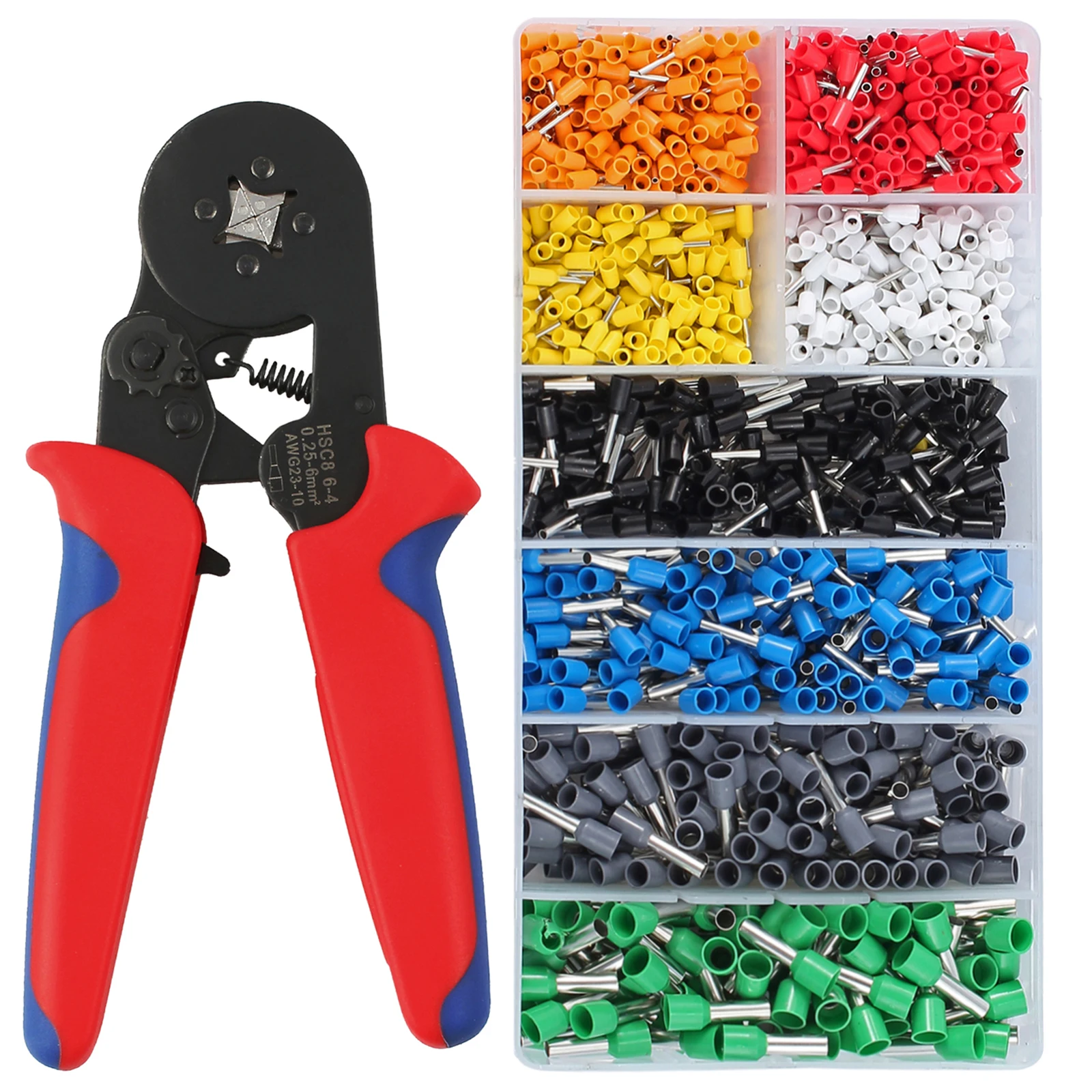 Overview: Wire Ferrule Crimp Tool is a newly designed crimping tool for wire ferrules. It is ideal for crimping insulated and non-insulated wire ferrules. The Crimp Too provides high crimping forces with low hand gripping power leading to less fatigue when used repeatedly. Features: 1. Ergonomic handle design provides improved gripping power. 2. Adjustable ratchet and lever action construction reduces fatigue degree. 3. Special four-mandrel crimping style for square crimp. 4. High quality crimping standard ensures repeatable crimping action. 5. Quick release safety lock. Specification: Handle Material: Nylon Color: Orange Body: HSC8 6-4 Range of Application: Wire-end ferrules Capacity mm²: 0.25-6.0mm² AWG: 22-10 Length: 175mm/6.89in Weight: 375g/13.23oz Ferrule Wire Terminals: Green: E6012 AWG 10, 100pcs Gray: E4009 AWG 12, 100pcs Blue: E2508 AWG 14, 100pcs Black: E1508 AWG 16, 100pcs Red: E1008 AWG 18, 200pcs White: E7508 AWG 20, 200pcs Yellow: E0508 AWG 22, 200pcs Orange: E0508 AWG 22, 200pcs Package: 1 × Ferrule Crimping Plier/Hand Crimping Tool 1200 × Terminal Wire Connectors