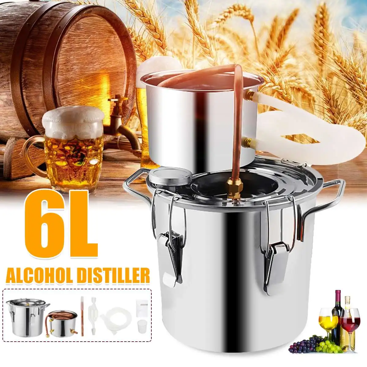 Этот набор домашнего дистиллятора-это полный набор для изготовления вина; Его очень легко настроить и использовать, он особенно подходит для производства духов с сильным ароматом (бренди, виски, фруктовый бренди и т. д.), также для эфирных масел (парфюмерия, средство и ликеры) Но больше всего для высококлассного спирта (водки). Он также может сделать чистую воду, и мы проверили все детали перед отправкой;