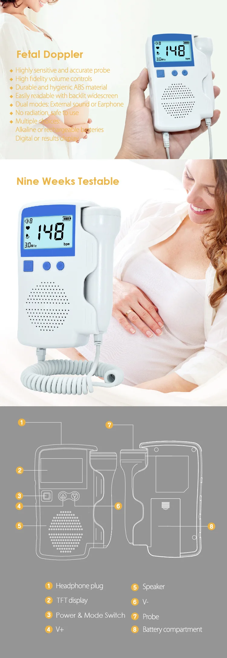 1. Чистый звук сердца плода: высокая производительность, чистый звук сердца плода. 2. ЖК-дисплей: многопараметрический режим работы и дисплей сердечного ритма плода, прозрачный FHR (фетальный пульс) дисплей. 3. Высокая чувствительность: медицинский класс, высокая чувствительность водонепроницаемого зонда, отсутствие излучения для обнаружения, низкая Ультразвуковая мощность, безопаснее для плода 4. Совместимость с наушниками и динамиками (наушники в комплект не входят). 5. Идеально подходит для прослушивания и записи сердцебиения вашего новорожденного ребенка, когда ей 12 недель выше. 6. Легкий и удобный для переноски, вы можете поделиться своей радостью-здоровым и сильным сердцебиением с вашим любовником, семьей и друзьями, независимо от того, находитесь ли вы дома или на улице.