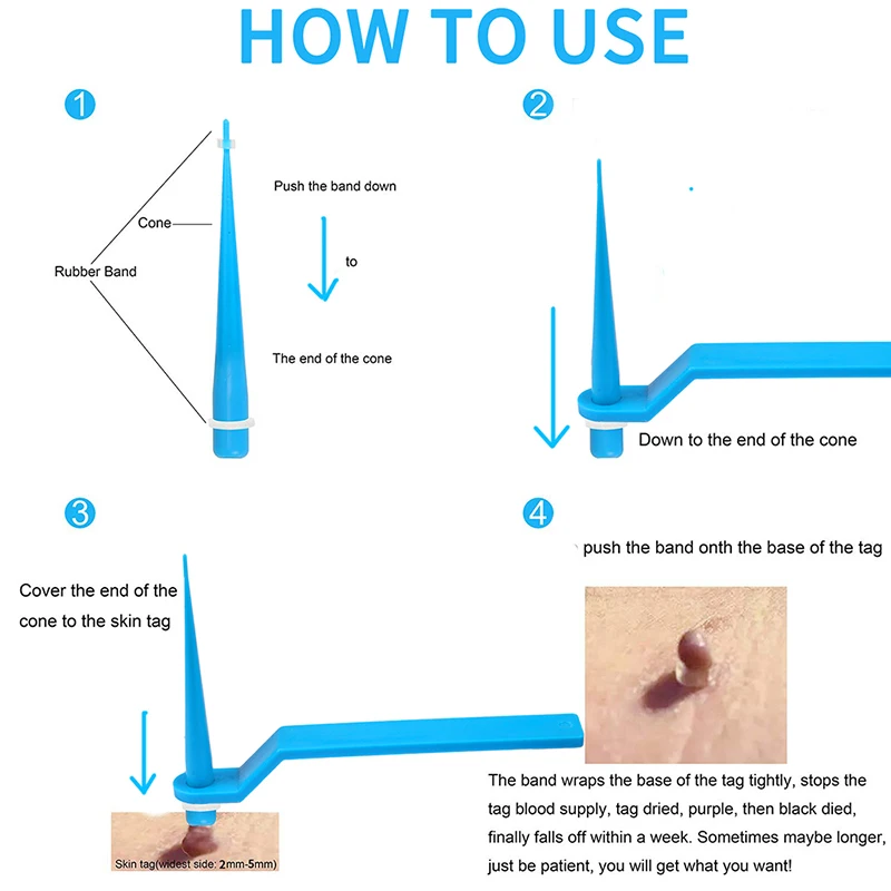 Прикрепленный ремешок затянет на основание кожного ярлыка и остановит кровообращение с бирками кожи, приведет к падению кожного ярлыка