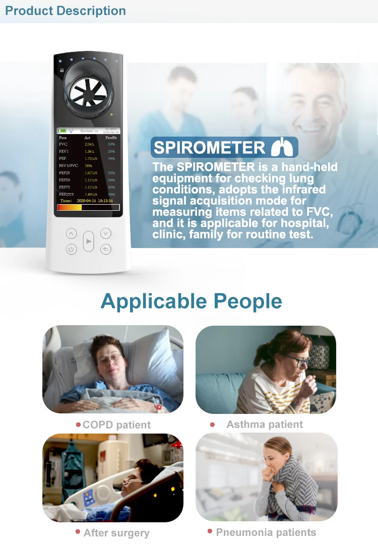 SPIROMETER is a hand-held equipment for checking lung conditions, it adopts the infrared mode for measuring relative items, and is applicable for hospital, clinic, family for routine test.