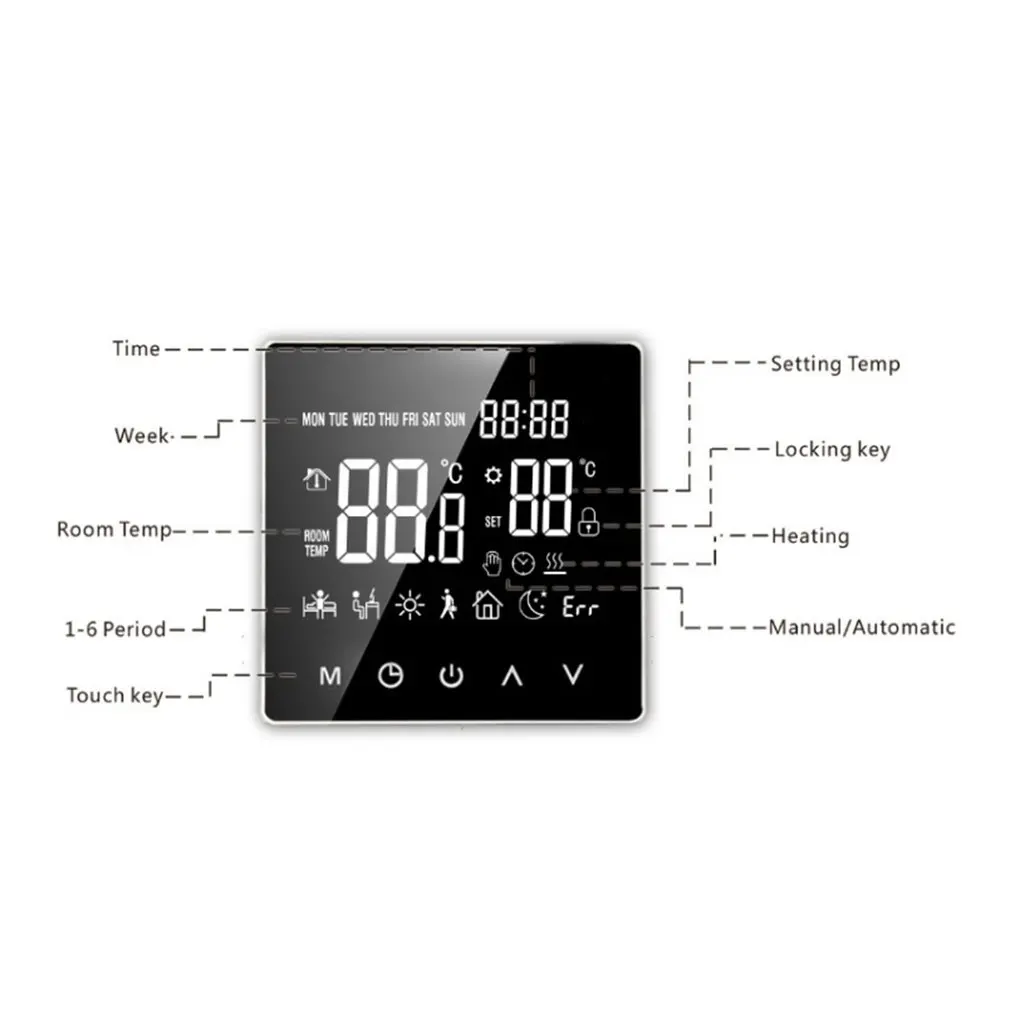 Этот продукт является ЖК-сенсорным интеллектуальным регулятором температуры с несколькими режимами и настройками температуры, которые можно регулировать в соответствии с потребностями пользователей. Функция блокировки ребенка гарантирует, что дети не будут ранены по ошибке.