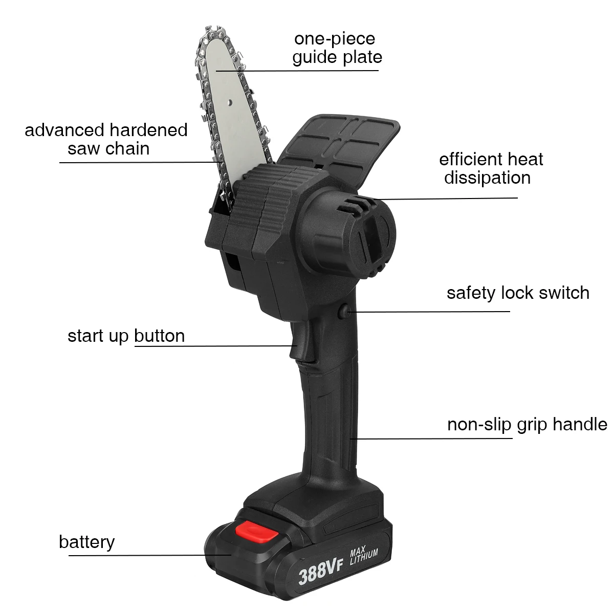 9. Гуманизированная конструкция: Интегрированная направляющая пластина быстро рассеивает тепло и очень устойчива к падению и истиранию. С нескользящей ручкой, очень удобно. Переключатель цепной пилы может регулировать скорость в соответствии с силой, и вы можете регулировать скорость резки, которая вам нужна в соответствии с условиями эксплуатации.