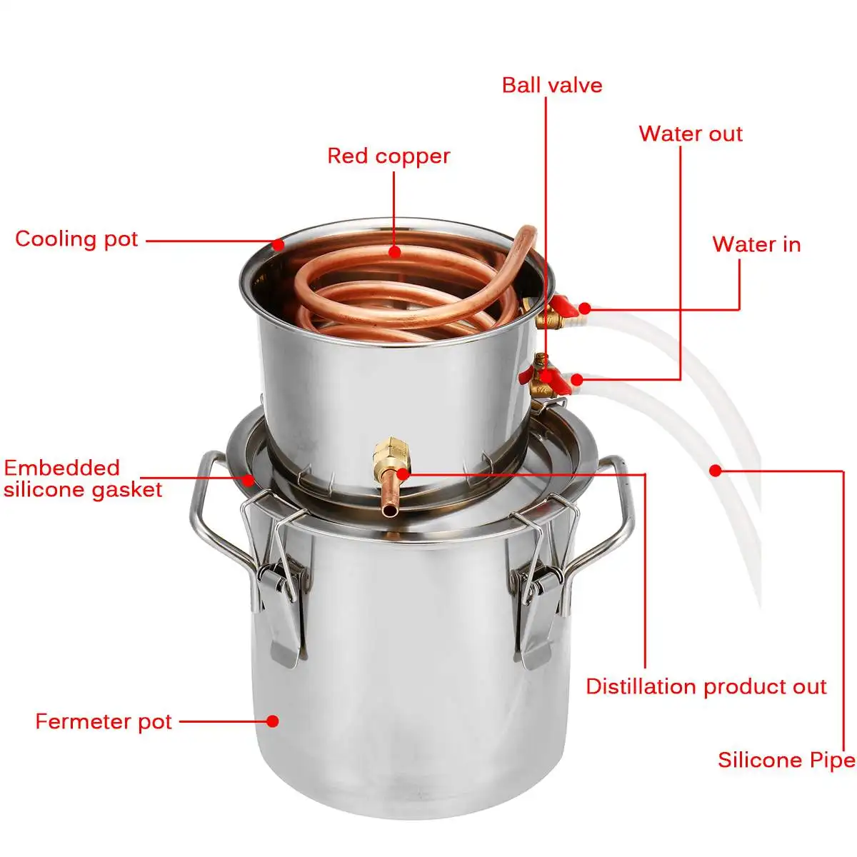Этот набор домашнего дистиллятора-это полный набор для изготовления вина; Его очень легко настроить и использовать, он особенно подходит для производства духов с сильным ароматом (бренди, виски, фруктовый бренди и т. д.), также для эфирных масел (парфюмерия, средство и ликеры) Но больше всего для высококлассного спирта (водки). Он также может сделать чистую воду, и мы проверили все детали перед отправкой;