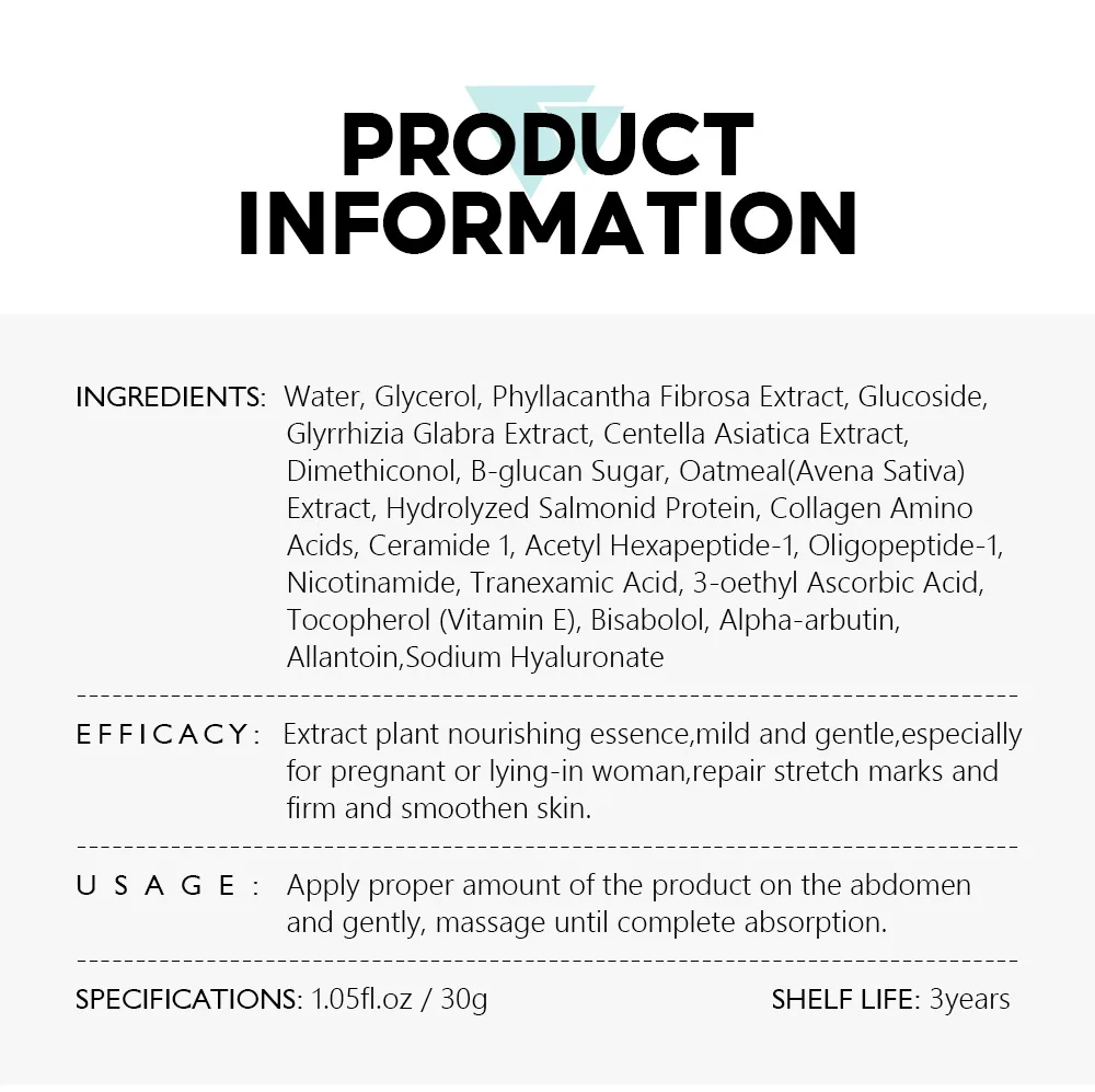 [Основные компоненты] Глицерол, бутиленгликоль, каприлия, триглицерид Каприка, изодецил танонаноат, гречберридерево (BUTYROSPERMUM PARK I) фруктовый жир, цетеариловый спирт глюкан сахар, экстракт овсянки, гидролизованный соленоидный белок, коллагеновые аминокислоты, керамида 1, ацетилгексапептид, олигопептидель, никотинамид, таномедовая кислота, аскорбицид, токоферол (витамин е), Бисаболол, гиалуронат натрия [Эффективность продукта] Извлеките натуральное растительное питательное вещество, непрерывно высвобождая свежую и энергичную энергию, мягкое и нежное, особенно для беременных женщин для восстановления линий беременности путем подтягивания и сглаживания кожи. Поддерживает удержание влаги и помогает уменьшить появление следов и шрамов, улучшает релаксацию, грубые тонкие линии и другие проблемы с кожей, восстанавливает нежную гладкую кожу [Типы кожи] Подходит для различных типов кожи [Характеристики] 1,05 floz (30 г)
