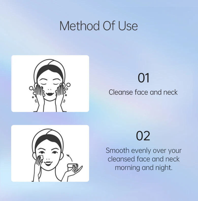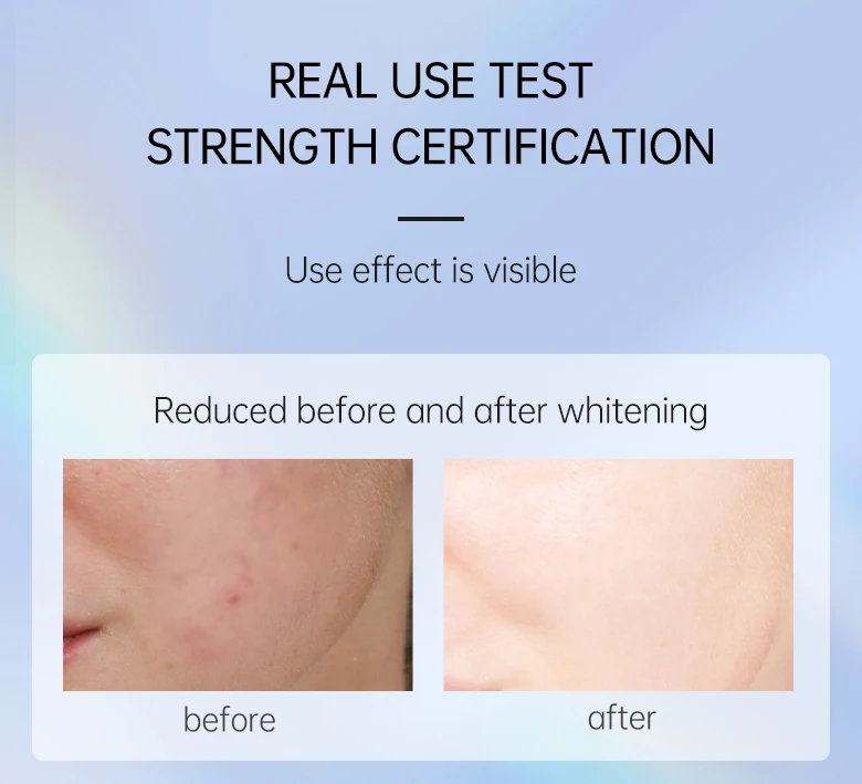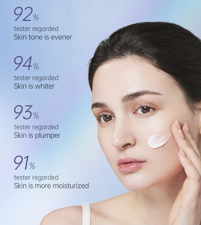 Сочетание niacinamideand alpha-arbutin в ультра светящейся коже отбеливающий крем для лица обладает двойной функцией. И niacinamideand alpha-arbutin могут ярко отбеливать кожу. Арбутин может ингибировать активный тирозиназ в клетках кожи, в то время как niacinamide может устойчиво отбеливать кожу. Отбеливающие факторы производятся по технологии нанесения покрытия в этом отбеливающем креме. После нанесения на кожу отбеливающие факторы быстро впитываются кожей. Кожа становится ярче и белее в течение нескольких недель.