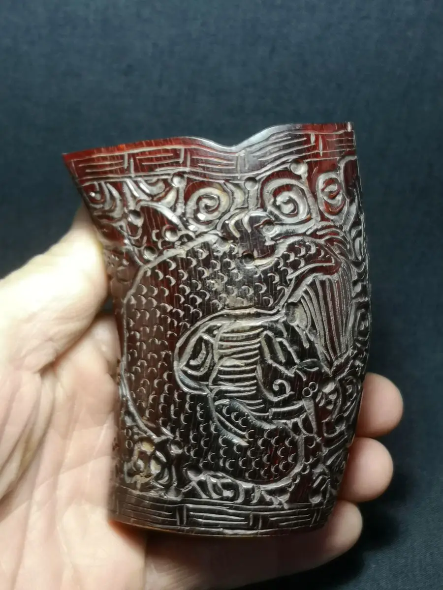 Коллекция 1919 Китай Тибет старый рог яка ручная резьба Дракон напиток чашка семья украшение подарок