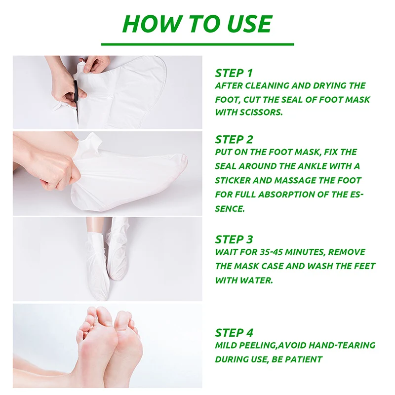 3. Носите маску для ног, мы рекомендуем носить пару нормальных носков снаружи, чтобы обеспечить достаточный контакт с эссенцией.