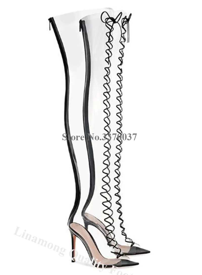 Сапоги выше колена из ПВХ пикантные Прозрачные высокие сапоги-гладиаторы с острым носком на шпильке вечерние сапоги на шнуровке