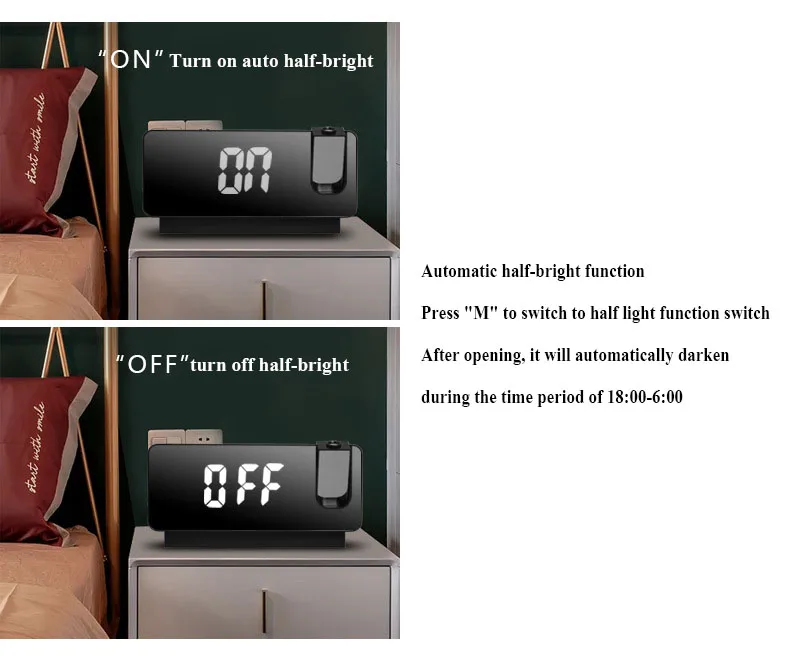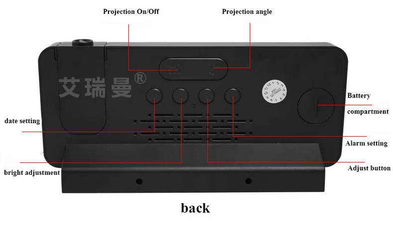 Проекция времени ясна, угол регулируется, и кнопка контролирует проекцию, чтобы открыть-(лучшее расстояние проекции находится в пределах 3 метров)