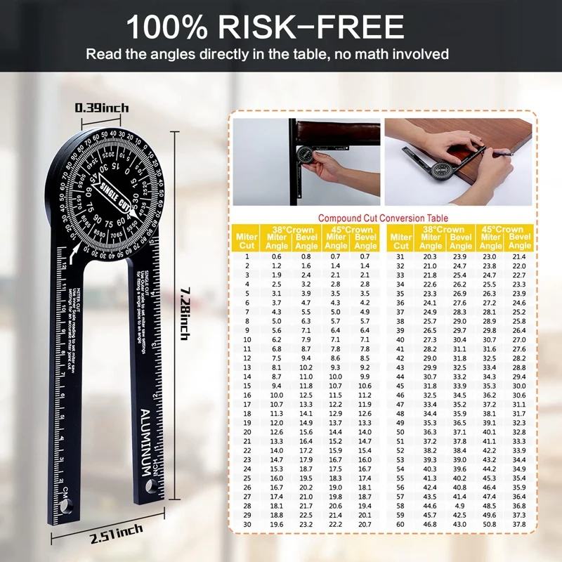 [Прочный и легко читаемый] инструмент для резки пилы изготовлен из высококачественного алюминиевого сплава и анодированной обработки поверхности, которая имеет сильную коррозию и износостойкость, возможность долгосрочного использования. Miter protractor имеет Высокоточный циферблат с лазерной гравировкой с прозрачной белой маркировкой, контрастной на черном фоне, который легко читается, не легко носить и размываться, гарантируем, что вы сможете быстро считывать данные во время использования и повышать эффективность работы.