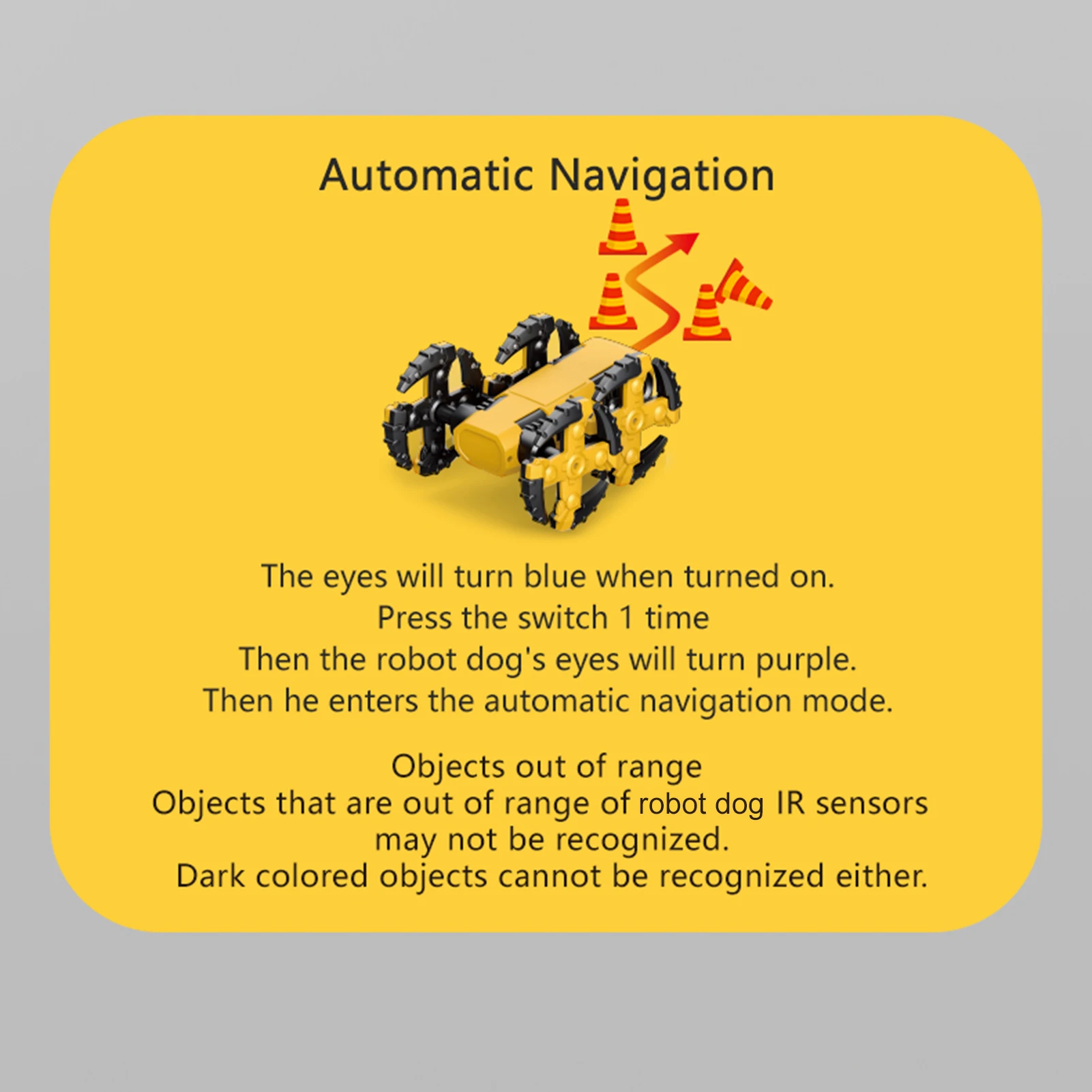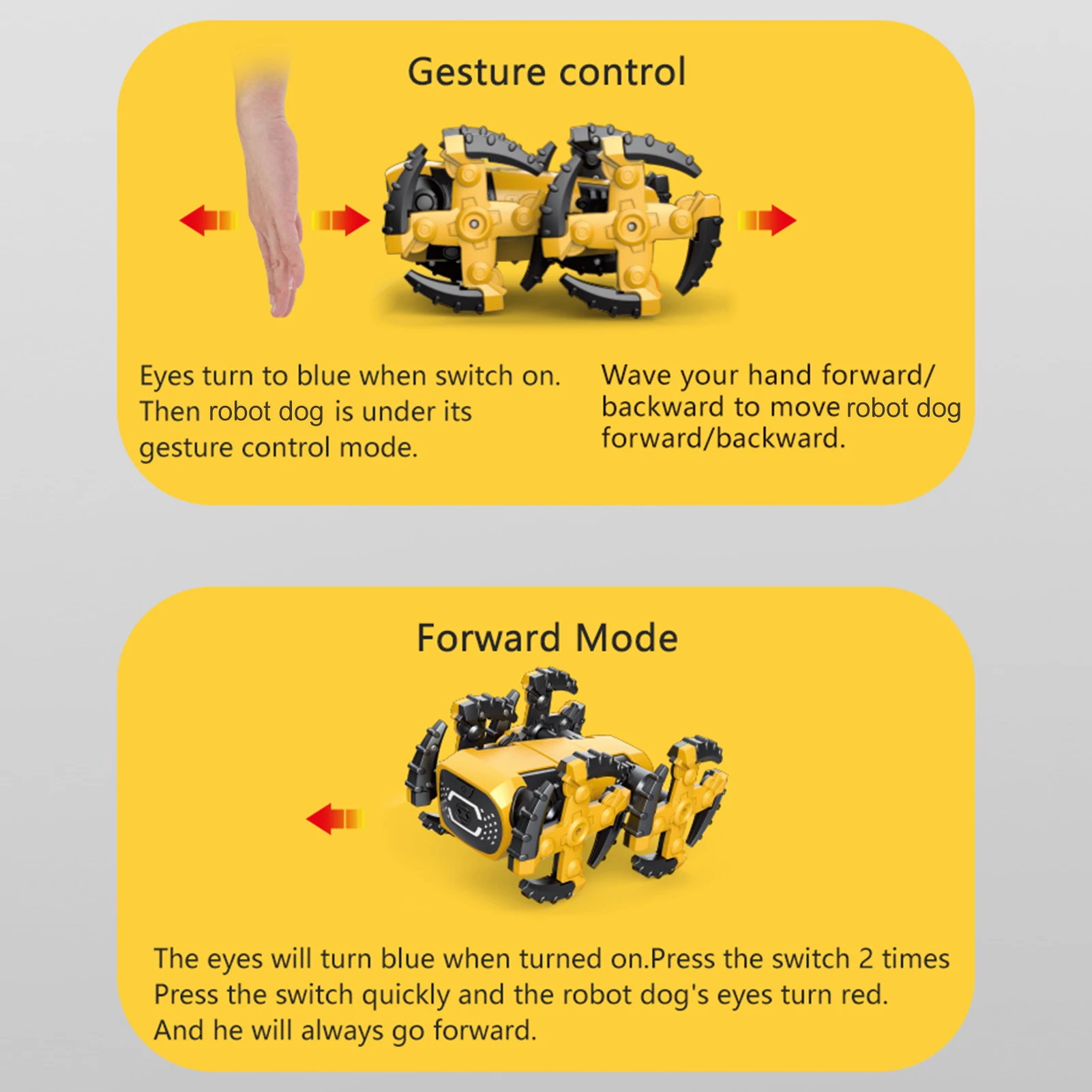 Режим Foward: при включении глаза будут синими. Быстро нажмите на переключатель, и глаза собаки-робота загорятся. И он всегда будет идти вперед.