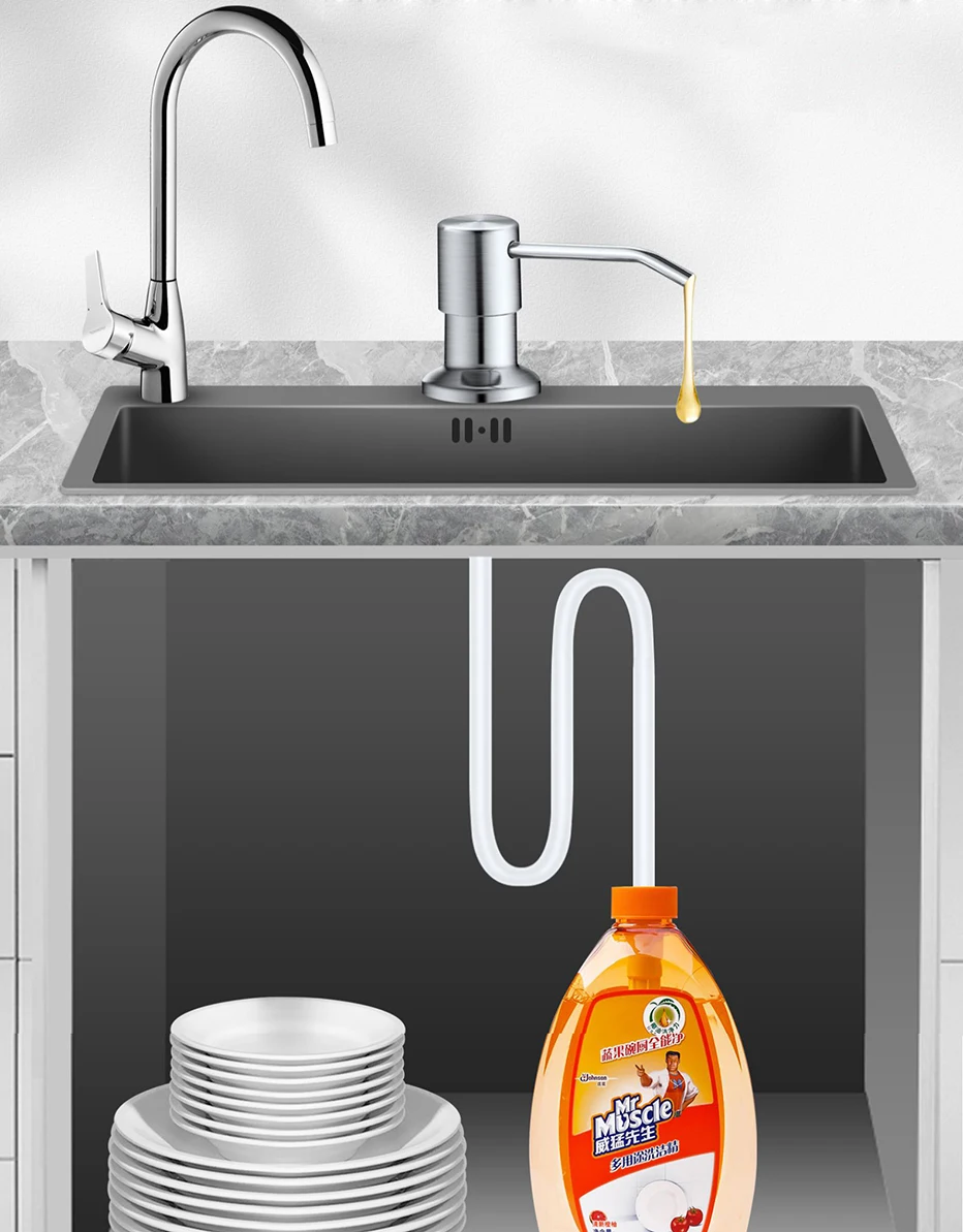 Встроенный дозатор мыла легко нажимается, сзади гладкая пружина проходит более 50000 испытаний на нажатие. Длительный срок службы для последовательного распределения дозатора мыла в раковине при каждом нажатии. Для мыла для рук, мыла для посуды, жидкого моющего средства или лосьона для рук можно использовать дозаторы мыла для раковины на кухне или в ванной.
