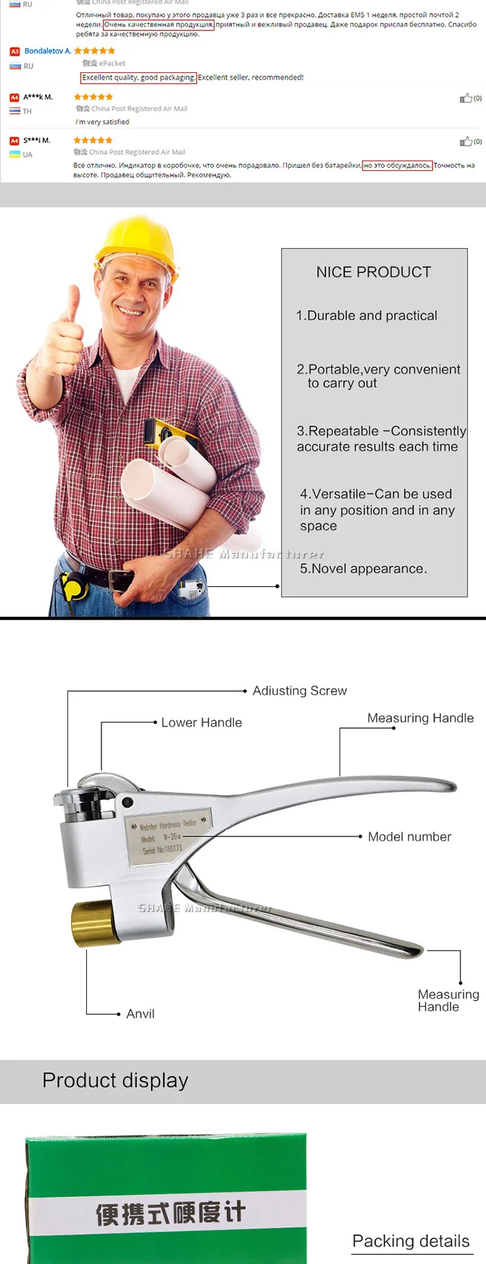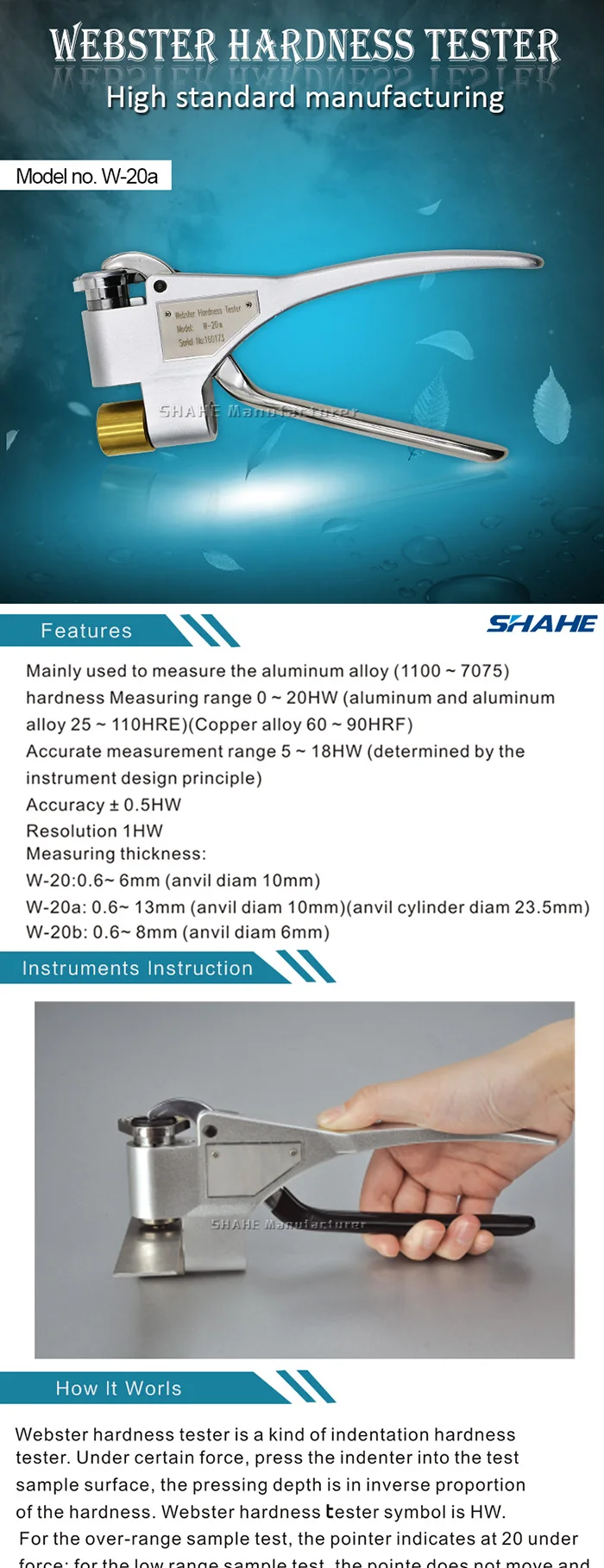 Измеритель Твердости Webster-это портативный инструмент, который может удобно измерять алюминий, особенно может измерять специальные формы заготовки, которые не могут быть или неудобны для измерения другими инструментами, такими как экструзии, трубы, пластины и так далее. Процесс тестирования не повреждает заготовку, и нет необходимости в получении образца, он специально применяется на производственной площадке, на площадке продаж или на строительной площадке.