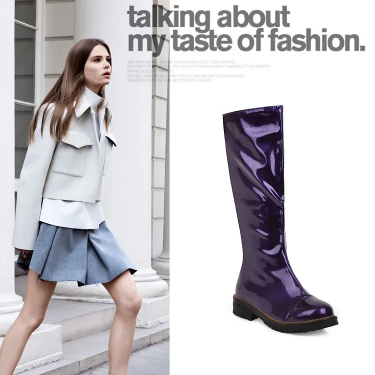 Женские сапоги до колена; обувь на не сужающемся книзу массивном среднем каблуке; женская обувь без застежки; chaussure zapatos mujer; ботинки-гладиаторы из блестящей лакированной кожи; HP2027