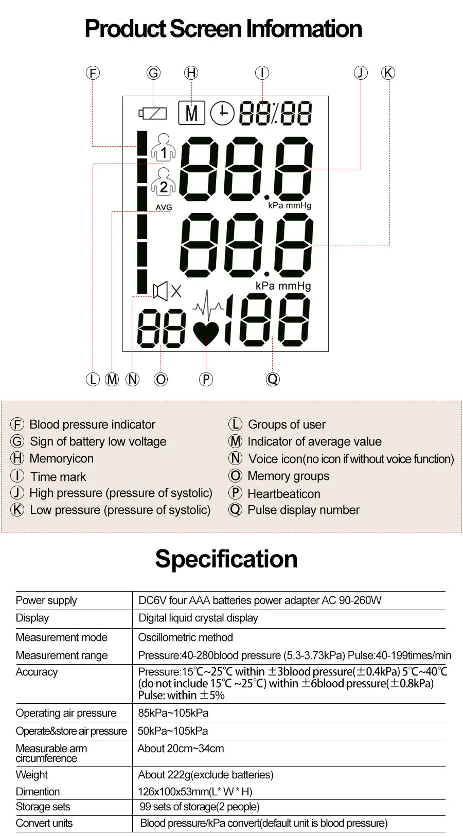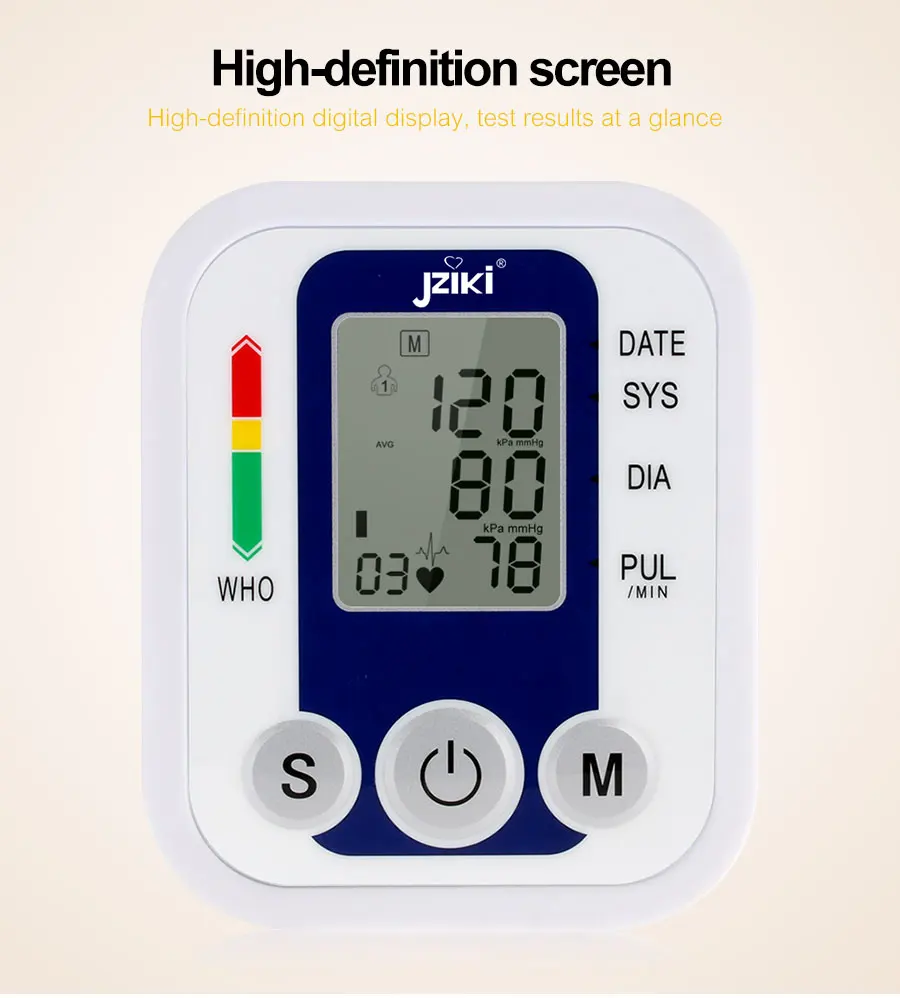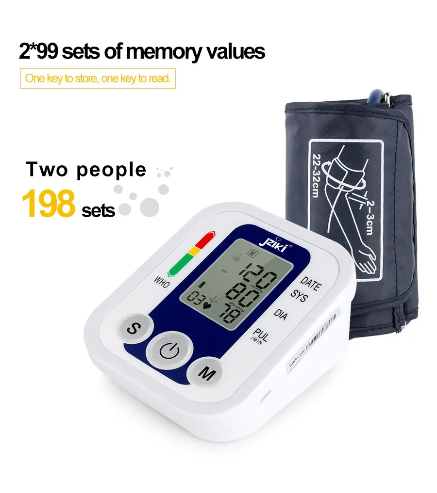 (1) Большой ЖК-дисплей легко читается (2)2 peoper 99 наборов хранения (3) измерение артериального давления и частоты пульса (4) Питание от 4 батарей xAAA или адаптера питания или переменного тока adpater (не входит в комплект) (5)99 наборов хранения для 2 пользователей (всего 180) (6) Интеллектуальный живой голос (7) Высокая точность и качество