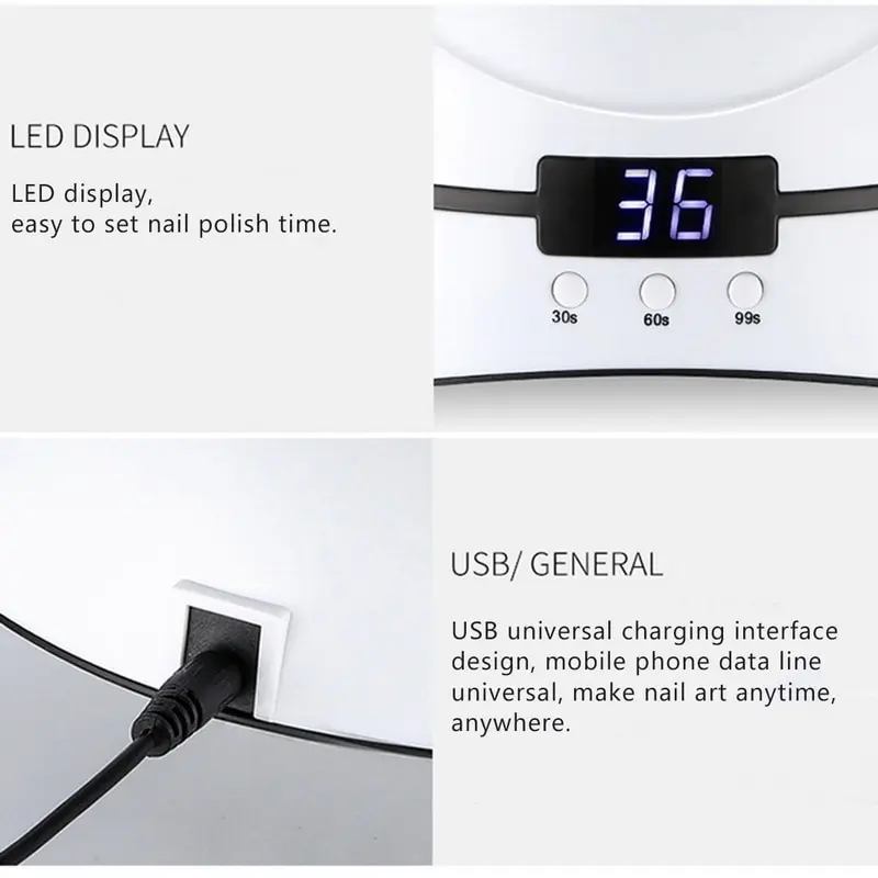 Размеры: 19 см * 12 см * 7,5 см Напряжение: 5 В USB Мощность: 36 Вт Белый цвет Настройка времени: 30 s 60 s 90 s Вес: 200 г Бусины лампы: 12 шт. лампа с бусинами Подходящий тип геля: УФ-гель/светодиодный гель/строительный гель все тип s гель Особенность 1: Портативный USB Особенность 2: УФ-лампа Особенность 3: легко носить с собой Особенность 4: не вредите коже Особенности 5: с обнаружением инфракрасного излучения Особенность 6: УФ-лампы Посылка включает в себя: Лампа для маникюра: 1 шт. USB кабель (1 шт.);Техническое обслуживание: Пожалуйста, используйте правильно. Не допускайте попадания жидкости в машину во избежание повреждений. Когда таймер отключен, пожалуйста, не используйте. Пожалуйста, отсоедините адаптер, когда вы уйдите в течение длительного времени. Пожалуйста, не используйте лампы для ногтей при отказе адаптера.