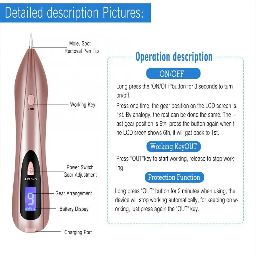 Машина использует высокие технологии и функцию карбонизации электрических ионов, которые могут эффективно подметать веснушки моментально, сениловые пластины, плоские родинки и т. Д. После использования, без кровотечения, без побочных эффектов, помогает вам достичь медицинской красоты.