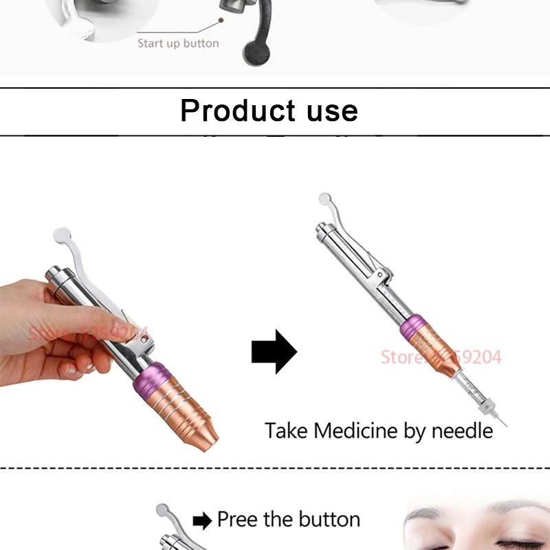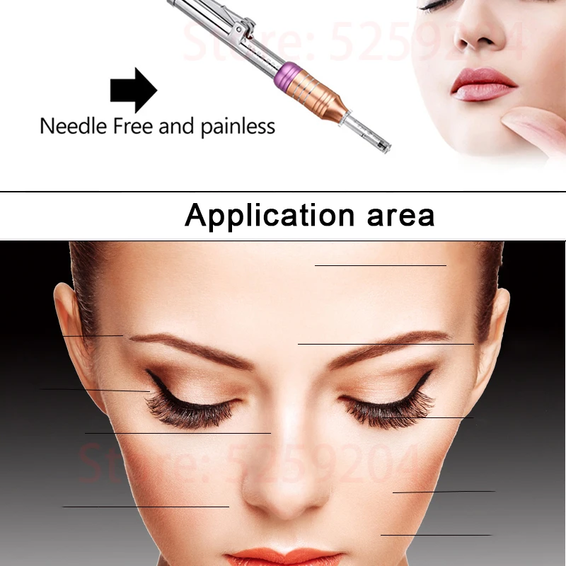 Product Description: Type:Hyaluronic Acid Pen Feature: Blood Vessels Removal, Skin Rejuvenation, Dark Circles, Wrinkle Remover, Weight Loss, Moisturizer, Whitening, Moisturizer Material:316 Stainless Steel ( professional medical stainless steel ) Injection volume:0.3ML Operation Mode:High Pressure Atomization / Multi shoot Injection depth:6-8mm Principle of operation: Spring and piston, which allow, under pressure, quickly and evenly inject drugs under the skin through a hole with a diameter of 0.1 mm, which is two times smaller than the needle thickness for injection! With the help of the energy of mechanical action, the spring and the special piston in the apparatus allow, under pressure, quickly but gently pushing the drug stream through a microscopic hole into the subcutaneous tissue. Drugs are absorbed much better and faster than with the introduction of a needle, which was confirmed in a series of studies and tests conducted in different countries of the world. The ideal solution for those prone to scarring and subcutaneous clots. Advantages of Hyaluron Pen: * Painless injection * Injection without needle eliminates the risk of infection from the needle * Does not leave scars and puncture marks of the skin tissue with a needle * Better and faster absorption of drugs * Strictly subcutaneous injection - eliminating the risk of penetration of the drug into the muscle * Fast, easy and safe * Separate and economical dosing of the drug Note: If you could not use the hyaluronic fillers (or other beauty medicine)before,you't better to consultate the beautician. How to use : Step 1 - Rotate the pen clockwise to 00 scale (end of the scale). Move the handle to add pressurize first, then load the ampoules head on the pen.