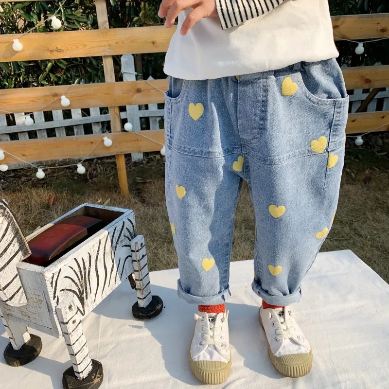 2020 г., синие модные штаны для маленьких девочек, От 2 до 7 лет г. Летние повседневные джинсы с сердечками джинсовая одежда, эластичные брюки, кальсоны