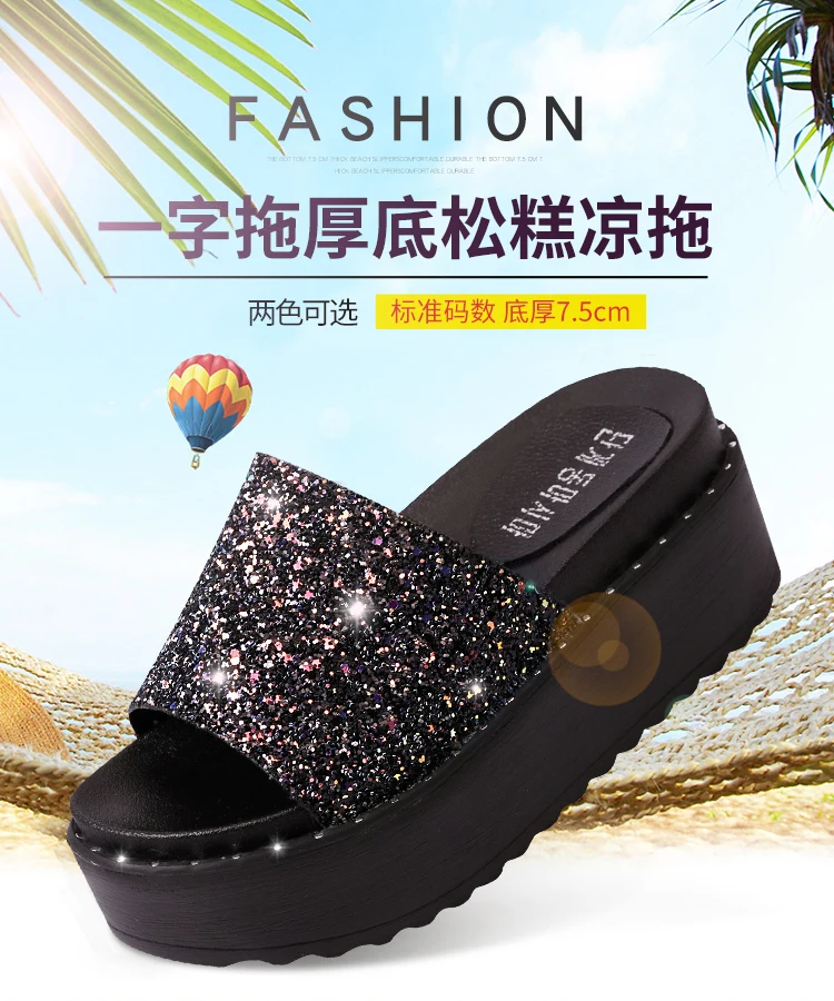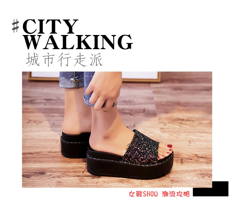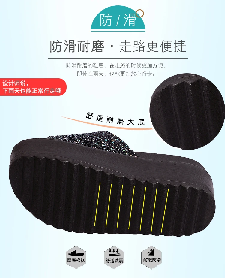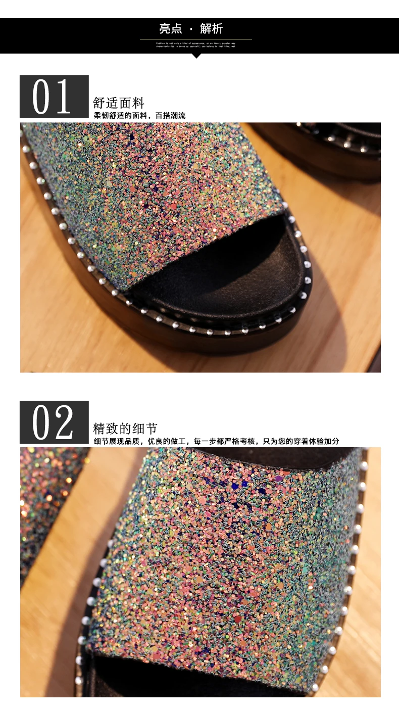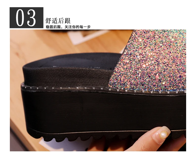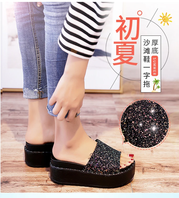 Женские блестящие туфли, без шнуровки, обувь 2018 Новинка в Корейском стиле; Модные женские туфли на платформе женская обувь на танкетке; Летние вьетнамки со стразами; Пляжные шлепанцы без задника с открытыми пальцами