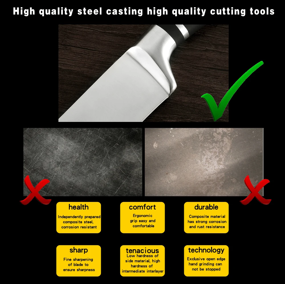Материал лезвия: нержавеющая сталь 3cr13 Материал ручки: нержавеющая сталь и АБС-пластик Особенности: антипригарное покрытие, легко режется, очень острое, высокая твердость, высокая прочность, долговечность, высокое качество, супер защита от ржавчины, светильник энергия и т. д.
