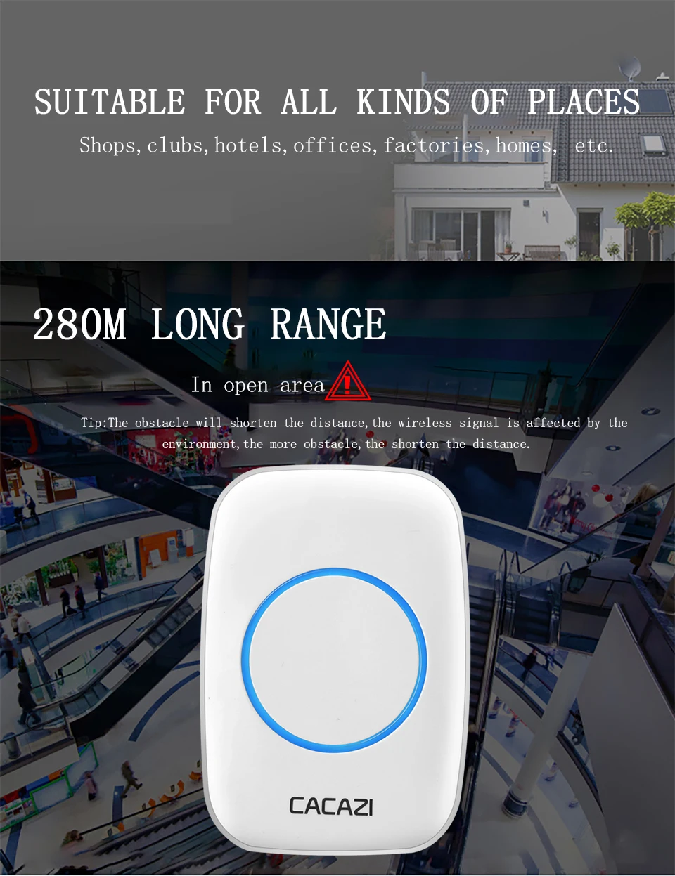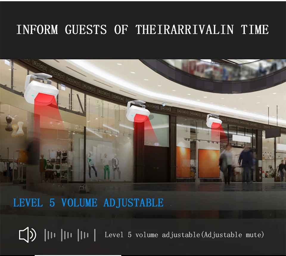 3 режима Дверной звонок режим Вызова скорой помощи режим Добро пожаловать в режиме оповещения 52 Мелодии 6 языков приветственного оповещения 45 дверной Звонок музыка 1 аварийный звонок 5 уровней громкости 0-110dB (можно отключить звук) 280 м (на открытой местности) Препятствия сокращает расстояние, беспроводной сигнал влиять окружающая среда, тем больше препятствий, сокращает расстояние. Отличить музыка Если несколько датчик сочетаются с одним или несколькими приемниками в одной и той же системы, каждый датчик может быть установлен на разные мелодии. Индукционный диапазон: для детей от 2 до 8 лет, M (в зависимости от температуры окружающей среды) Размер сенсора: 82*45*74 мм Размер приемника: 95*65*24 мм