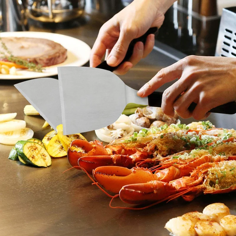 Удобный передний край легко скользит под пищей, длинная плоская поверхность переворачивается и удерживает больше пищи, гладкое лезвие и прочная ручка хорошо сбалансированы, угловая средняя часть держать вас подальше от сжигания рук